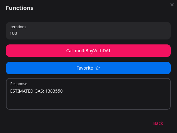 8. Open it and call the function multiBuyWithDAI() with iterations 100, this will purchase 100 [GIMME FIVE](https://affection.gitbook.io/docs/token-contracts/gimme-five-5) from the contract in one transaction\ <br>