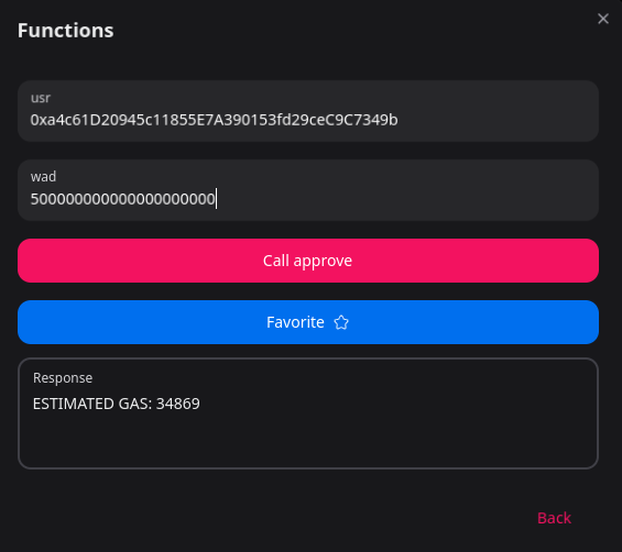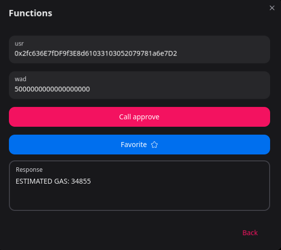 3. Open the [pDAI](https://affection.gitbook.io/docs/token-contracts/pdai-dai) contract and call approve() with spender [GIMME FIVE](https://affection.gitbook.io/docs/token-contracts/gimme-five-5) and amount 5000000000000000000